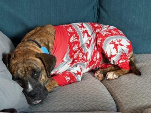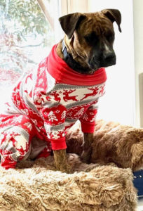 Amelia has learned “sit” and she has become much more cuddly.  She plays well with her foster brother and she also likes to meet other dogs on her walks.  Amelia takes treats gently.  She is doing wonderful with more time outside of the crate at night.  She is able to adjust her energy level to the other dogs she is interacting with.  Amelia recently got some new Christmas pajamas, and she is wishing for a forever home this holiday!