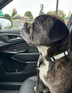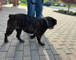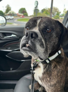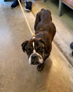 Felicity was found as a stray in really poor condition.  She was emaciated and weighed only 34 lbs.  The shelter estimated that Felicity is around 3 years of age.  They noted that Felicity is a sweet and affectionate girl.  She loves treats and she also tries to jump up and give hugs.  Felicity walks nicely on leash and she did well on her shelter dog test.   When our volunteer went to pick her up, we realized that Felicity is likely a bulldog or a bulldog/boxer mix.  She has gained weight and now weighs 40 lbs.  Her foster mom indicates that she is short, but very athletic!  She loves to pull every toy out of the toy box.  Felicity is a confident and talkative girl.  She is in foster with two other boxers and also a cat.   Felicity will be spayed soon and then will be ready for her forever home!