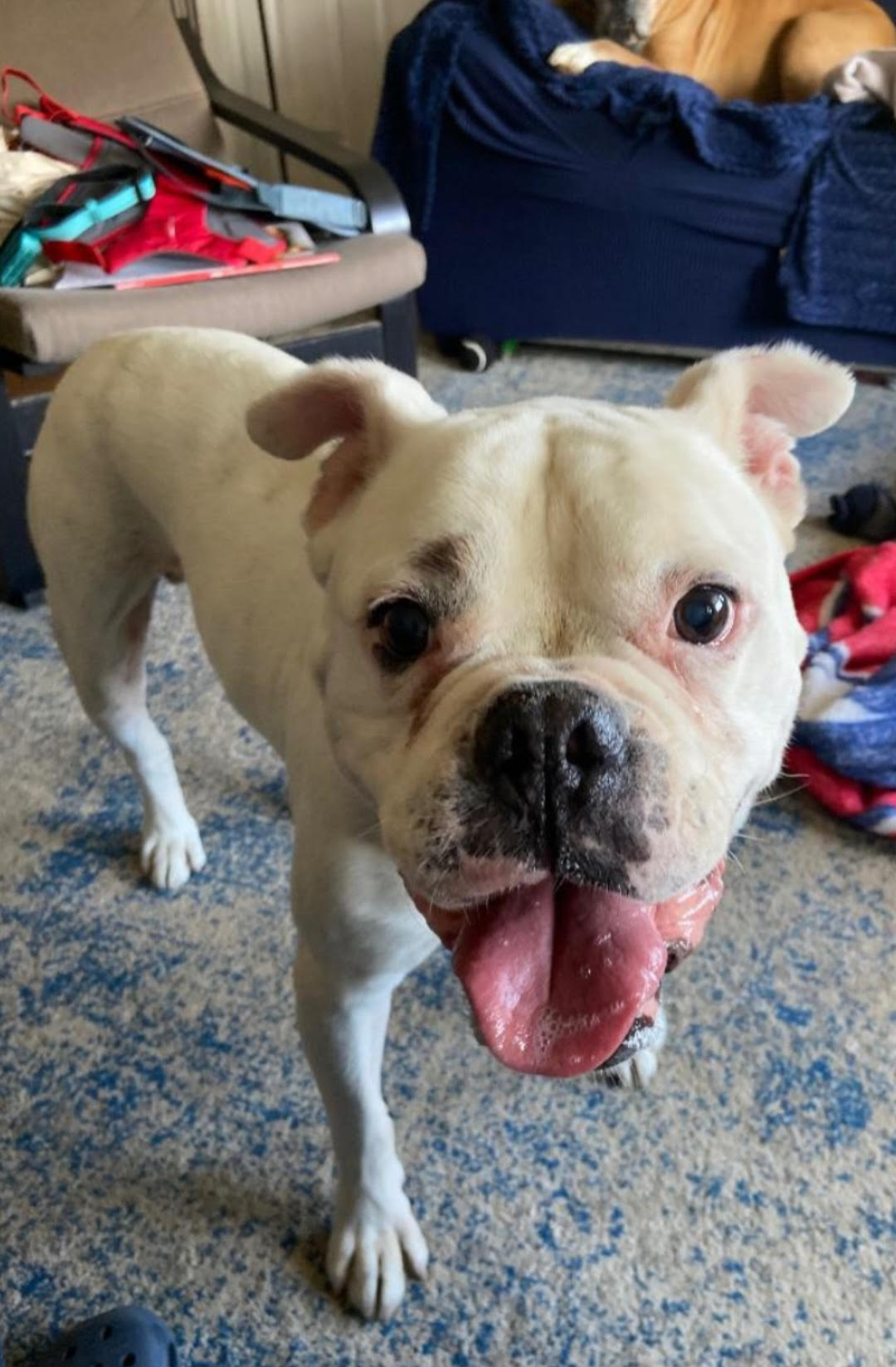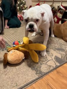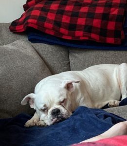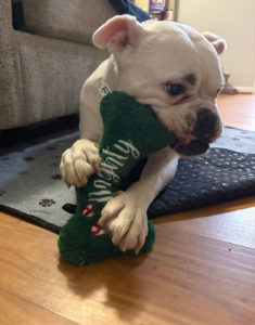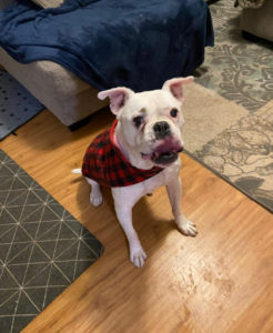 Hulk is hoping his luck will change for the new year.  He was brought to the shelter to be euthanized last November because his owner said he was old and miserable.  We were able to find a foster home to be able to bring him into rescue, where we discovered that Hulk had a urinary tract infection that had been untreated for quite some time.  After antibiotics, he is feeling so much better.  Hulk was also dealing with significant arthritis, so he is taking medications and supplements for that.  On New Years Eve, Hulk had to be rushed to the emergency vet due to labored breathing.  He had aspiration pneumonia, but has fully recovered with treatment in the hospital and follow up antibiotics.  Hulk would do best with a family that has somebody home during the day to let him out to potty – he needs a break every 4-5 hours.  His favorite things are staying close to his foster mom or snoozing on the couch.  Hulk absolutely loves his food and he is now using a slow feeder.  He has some favorite toys that squeak or make noise.  Hulk is very good when putting on his coat to go outside in the cold.  He enjoys walks, but can’t go too far due to his arthritis.  Hulk is a laid back gentleman who just wants a family to give him the opportunity to enjoy his senior years.  We just found out that Hulk’s current foster home is having a knee replacement in early March, so he will need a new placement.  Ideally, we would love to find an adoptive home so Hulk will only have to make one transition.  If we do not have a home for adoption, though, he will be in urgent need of a new foster placement in the next month.  If you are interested in providing a foster or forever placement for this adorable boxer/bulldog senior, please contact your coordinator or apply today for Hulk!