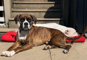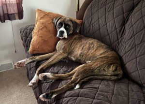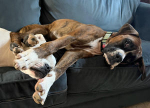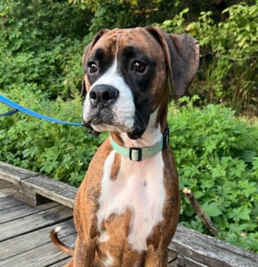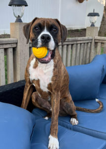 Magic continues to amaze his foster mom with his progress and sweet personality.  Whether it’s his growing self-control or his unmatched cuddling skills, this lovable boxer proves every day that he’s ready for his forever home.  Over the last few months, his foster home has been bustling with house projects, bringing a steady stream of new people through the door. Surprisingly, this has helped Magic build even more self-control. When he sees workers pulling into the driveway, his wiggle-butt begins but so does the barking; letting everyone know that someone is approaching.  However, with just a simple point to the crate, he goes in willingly, settles down, and quietly watches as they enter and begin their work. After patiently observing for a while, he’ll either take a nap or, if the visitor is a fan (and many are!), he gets his turn to come out and say hello.  Magic is in his happy place when he makes a new friend and that friend takes him outside to throw balls so he can show off his impressive catching skills, and then stays long enough to come inside and cuddle on the couch with him.   Watching him leap and play outside is always entertaining, but his snuggles have a way of melting hearts. The key to Magic’s success is patience. His future family will need to give him time and space to adjust to new people and settings. Once he’s comfortable, he’s ready to be the life of the party. And of course, regular exercise is essential but that’s no surprise for a young, athletic guy like him.  If you’re looking for a spirited, snuggly, ball-loving companion who’s learning to balance his energy with patience, Magic might be the perfect match for you.
