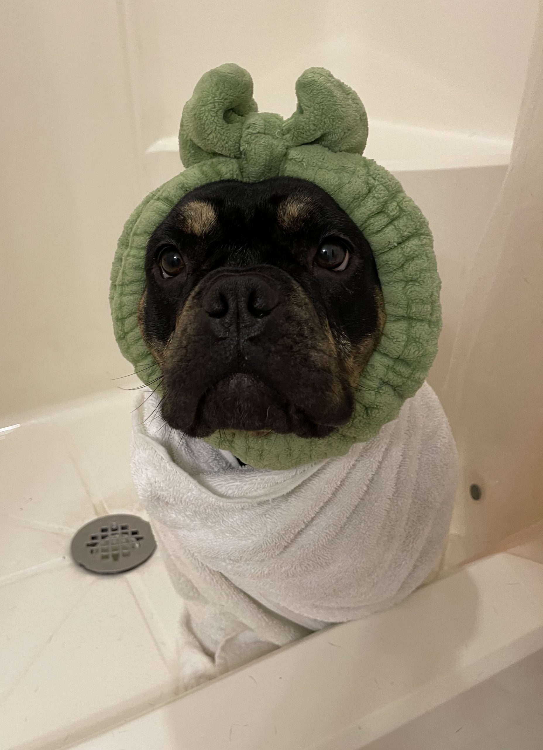 Roxxy is a very sweet, tiny little Frenchie mix. She loves to cuddle and sleep on her foster mom.