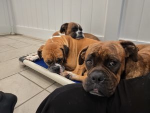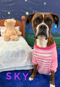 Sky is 2 yrs old, she needs another dog and a fenced yard. Dropped at a high kill shelter with 4 other boxers from the back of a pickup truck . So sad and traumatic . Good with dogs and kids. Housebroken and crate trained .
