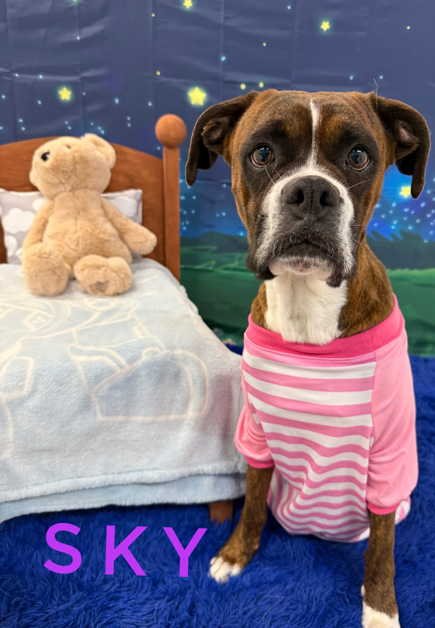 Sky is 2 yrs old.  She needs a home with another dog and a fenced yard. Sky was dropped off at a high kill shelter with four other boxers from the back of a pickup truck.  She is good with children and other dogs.  She is also reported to be housebroken and crate trained.