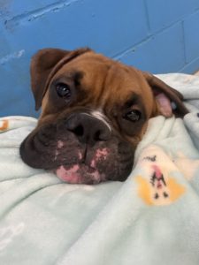Snoopy is the largest male from The Sunrise Seven.  He loves to go on walks, play with stuffies and be the biggest goof.  He was kept crated 24 hours a day for his entire 1 and 1/2 years of life, never going outside.  He lived in an apartment he shared with 8 other boxers.  Snoopy is a happy, loving, affectionate, and exuberant boy. He is learning all about this new life and taking it all in.  Snoopy needs a committed foster or adoptive home with a kind, loving heart and the patience to teach him all the things he needs to know about life.  He has such a big heart, he loves to love, and be close to his favorite volunteers.